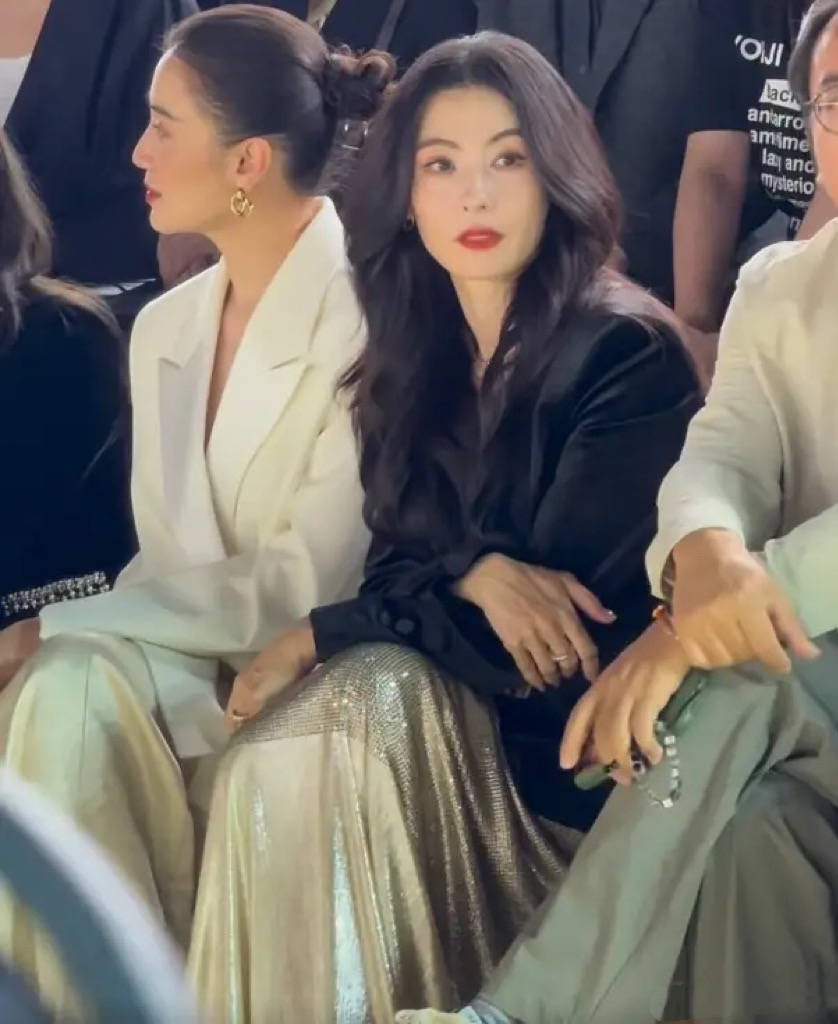 干练的西装、利落的大背头,金光闪闪的耳环,她坐在嘉宾席上、那么的松弛自在、优雅大方。一旁的张柏芝,分明是刻意打扮了。
