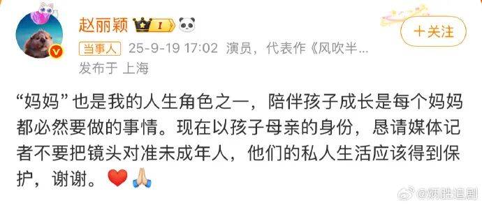 赵丽颖在文中表示:“‘妈妈’也是我的人生角色之一,陪伴孩子成长是每个妈妈都必然要做的事情。现在以孩子母亲的身份,恳请媒体记者不要把镜头对准未成年人,他们的私人生活应该得到保护,谢谢。”
