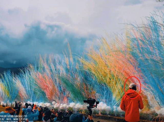 随着他一声令下,烟火分批次被点燃,山上瞬间升起大量彩色浓烟,场面盛大,蔡国强也完成了他又一“伟大”的作品。