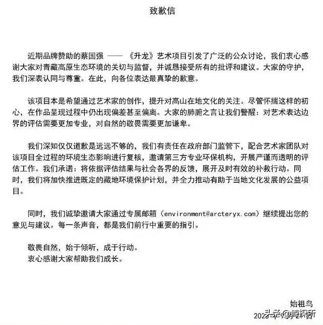 反观蔡国强和始祖鸟对于此事的道歉,更是引起了不小的争议。