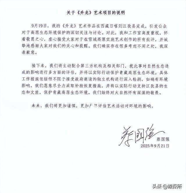 蔡国强在社交媒体上发文称,自己和工作室对此事高度重视,并且也虚心接受大家的批评,也表示愿意主动配合第三方机构对此事造成的影响进行多方面评估,也会尽全力采取补救措施的。