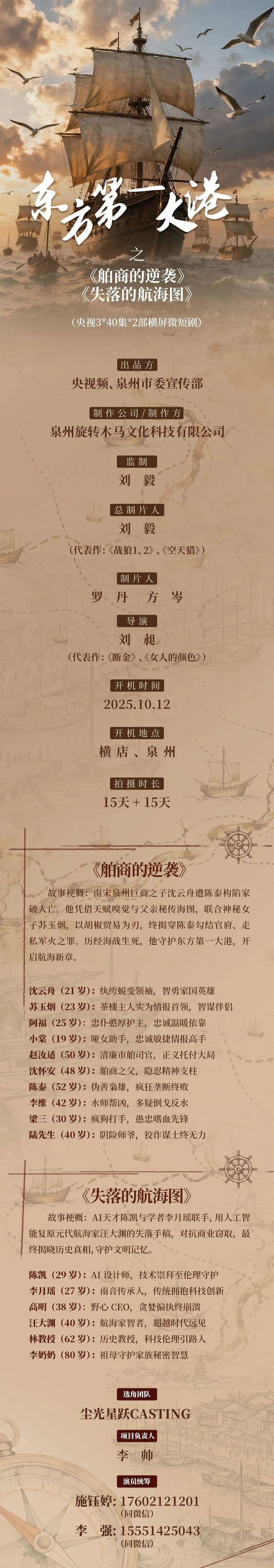 免责声明:戏客Seeker公众号(“本平台”)中全网组讯的信息、内容(“组讯信息”,包括但不限于影视项目名称、项目介绍信息、出品公司信息、导演信息、选角团队信息、拍摄相关信息、联系方式等)均来源于内容信息相关方提供或互联网公开信息。本平台不对组讯信息的真实性、准确性、完整性、及时性、关联性、适用性及安全性提供任何明示或默示的担保。请您谨慎参考或使用组讯信息,并确保您的人身、财产安全,本平台不对您使用或参考组讯信息而造成的后果承担任何责任。