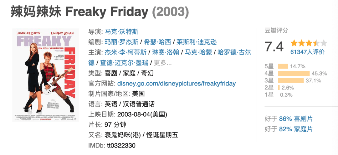 当初的《辣妈辣妹》是一个灵魂互换的故事,根据小说改编,其实2003年版本并不是影片的第一次改编,70年代就拍过一版,当时还是朱迪·福斯特演的。
