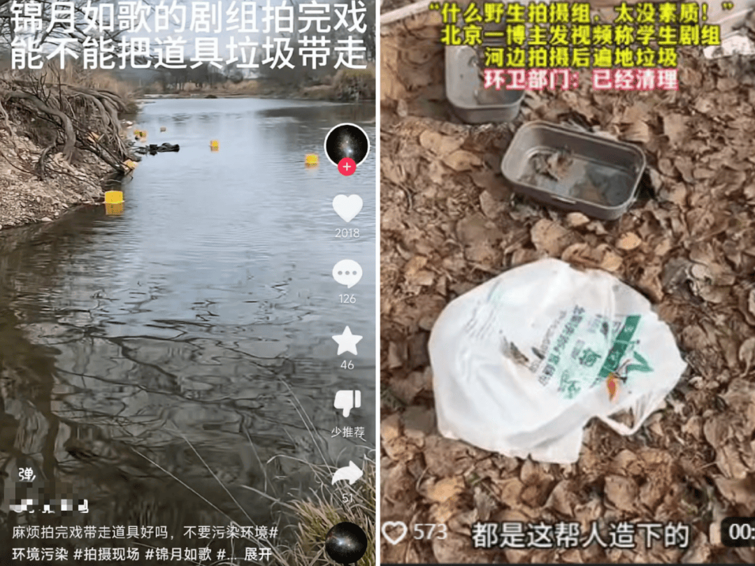 拍摄结束后,现场饭盒、酒瓶、塑料袋、雨衣等垃圾遍地,混凝土钢架和木质建筑也直接丢在了原地。
