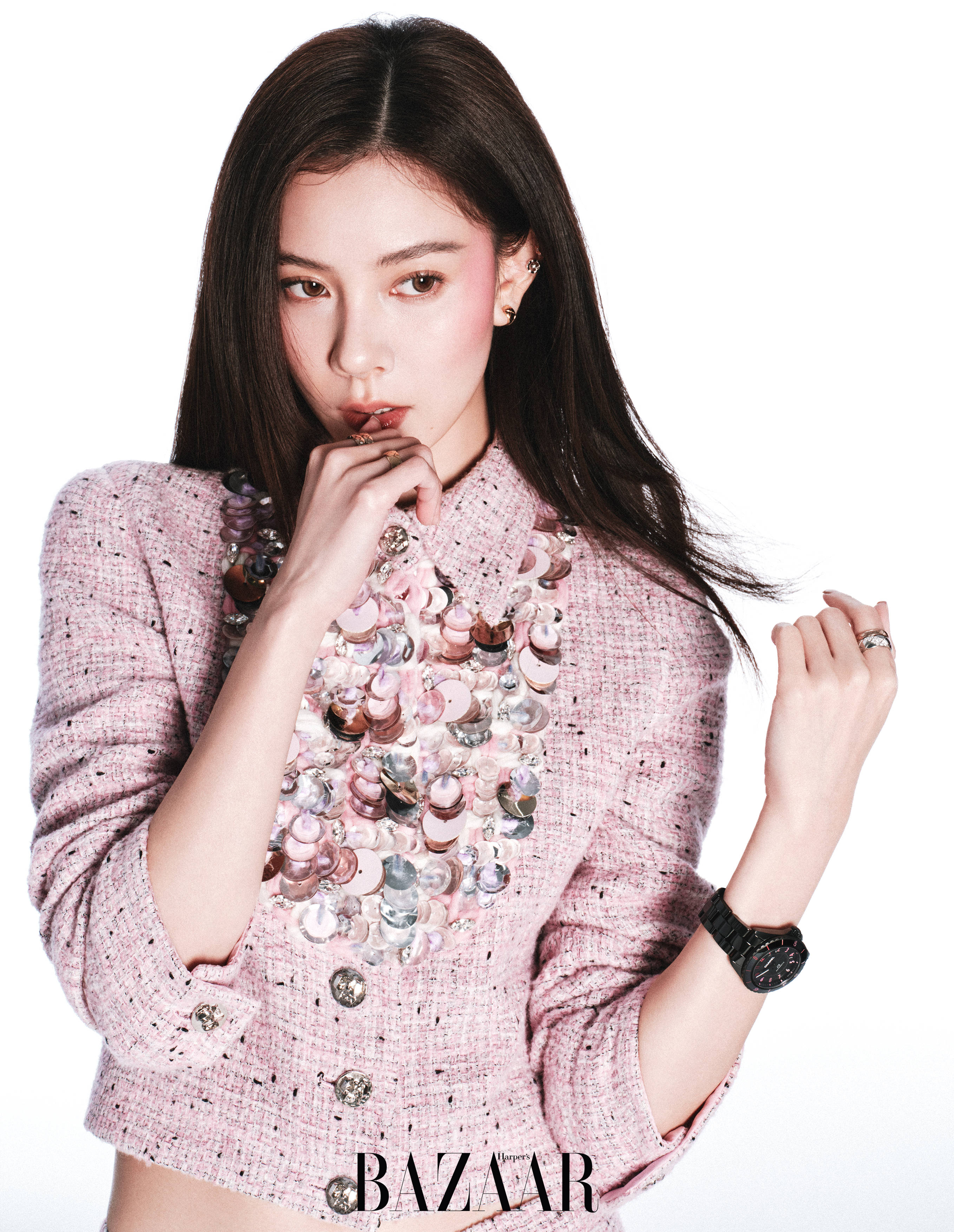 宋妍霏穿粉色套装,姿态娇俏。