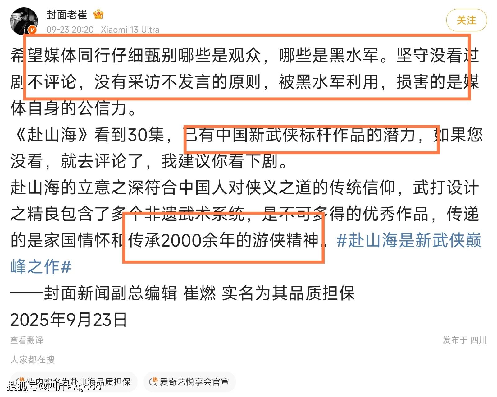 对此,一位自称是“封面新闻副总编”的网友,在网上公开发文,大肆夸赞成毅新剧《赴山海》太优秀。