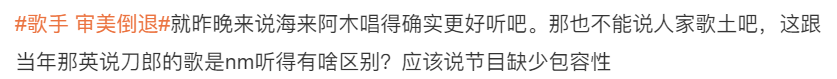 前期舞台迟迟出不了神作,后期痰音海来阿木战胜抽象黄宣,都曾让网友忍不住掰头华语乐坛审美问题,其中海来阿木与黄宣之战讨论最为激烈。
