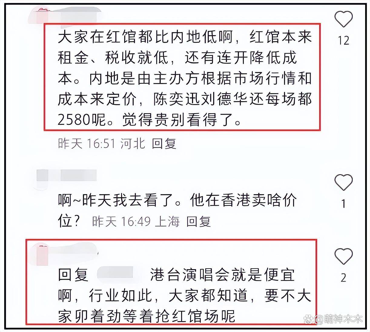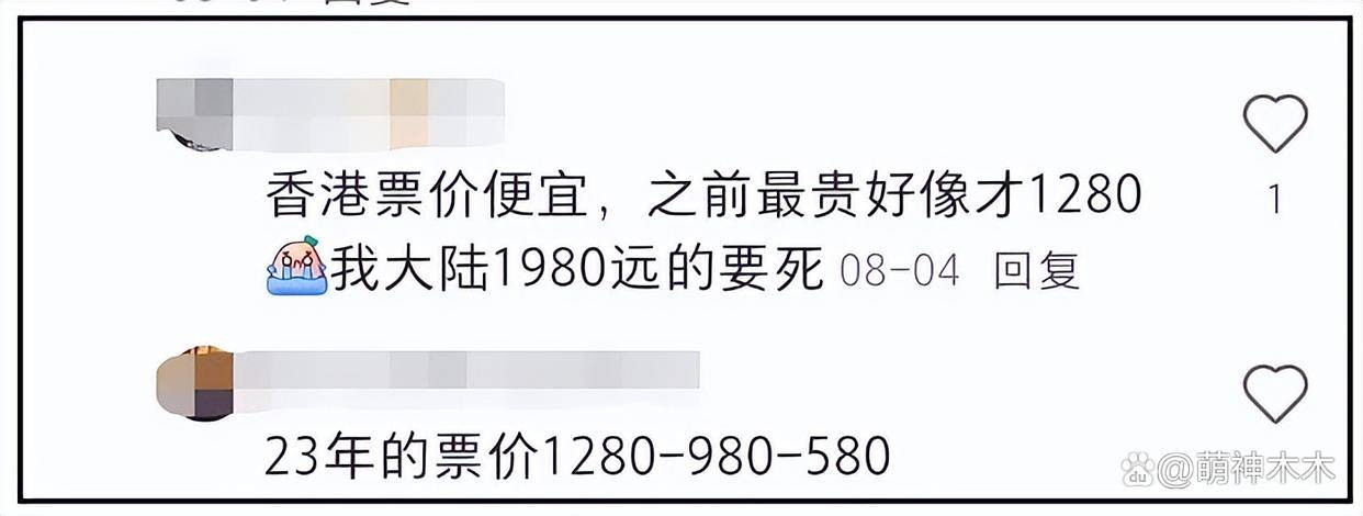 不少网友在评论中表达了不满。有网友提到,自己在上海以1280元购得的门票,现场感受却似在“山顶”;也有人透露,香港红馆的门票,最贵的前排票价也仅约1200元。