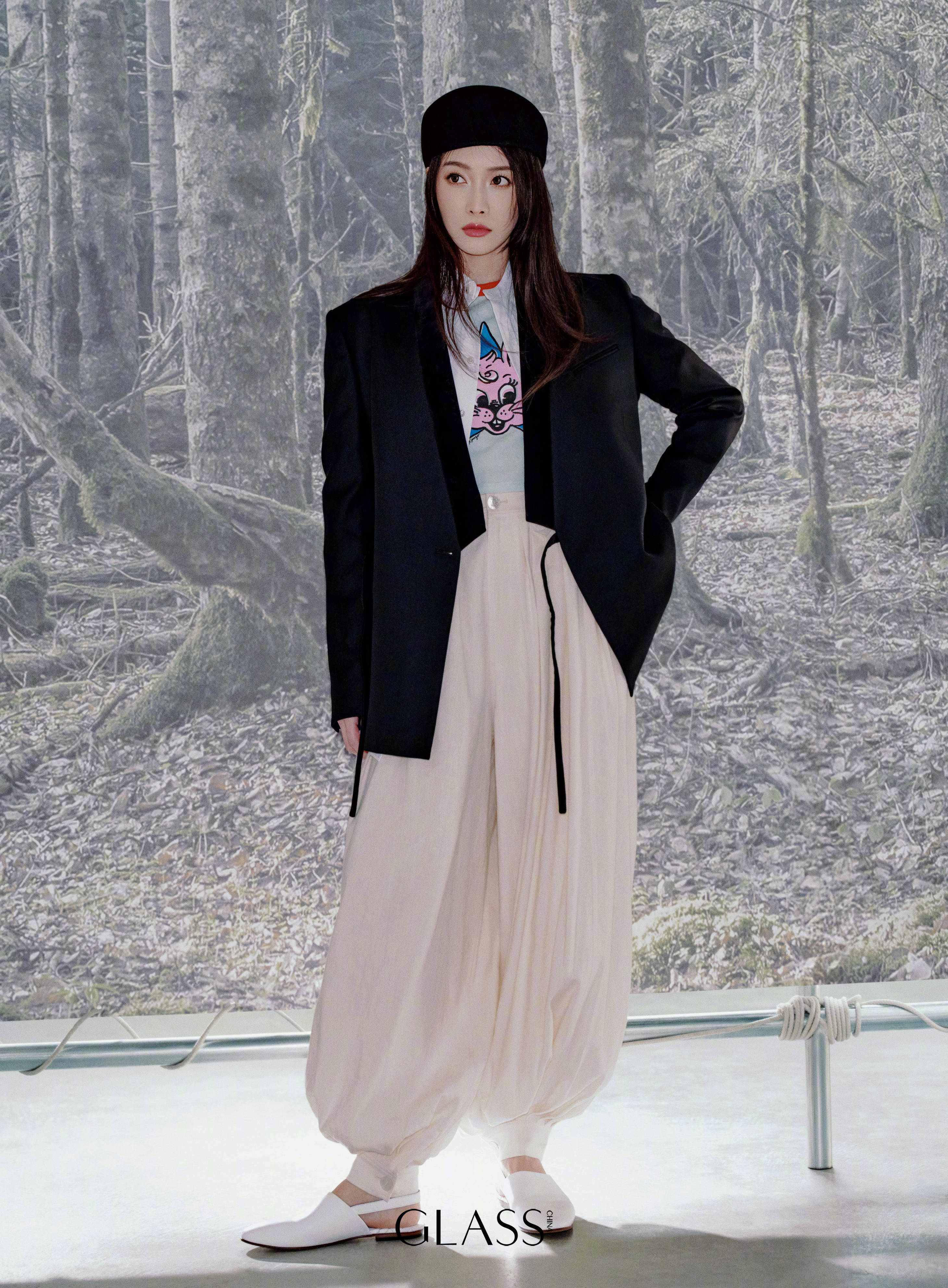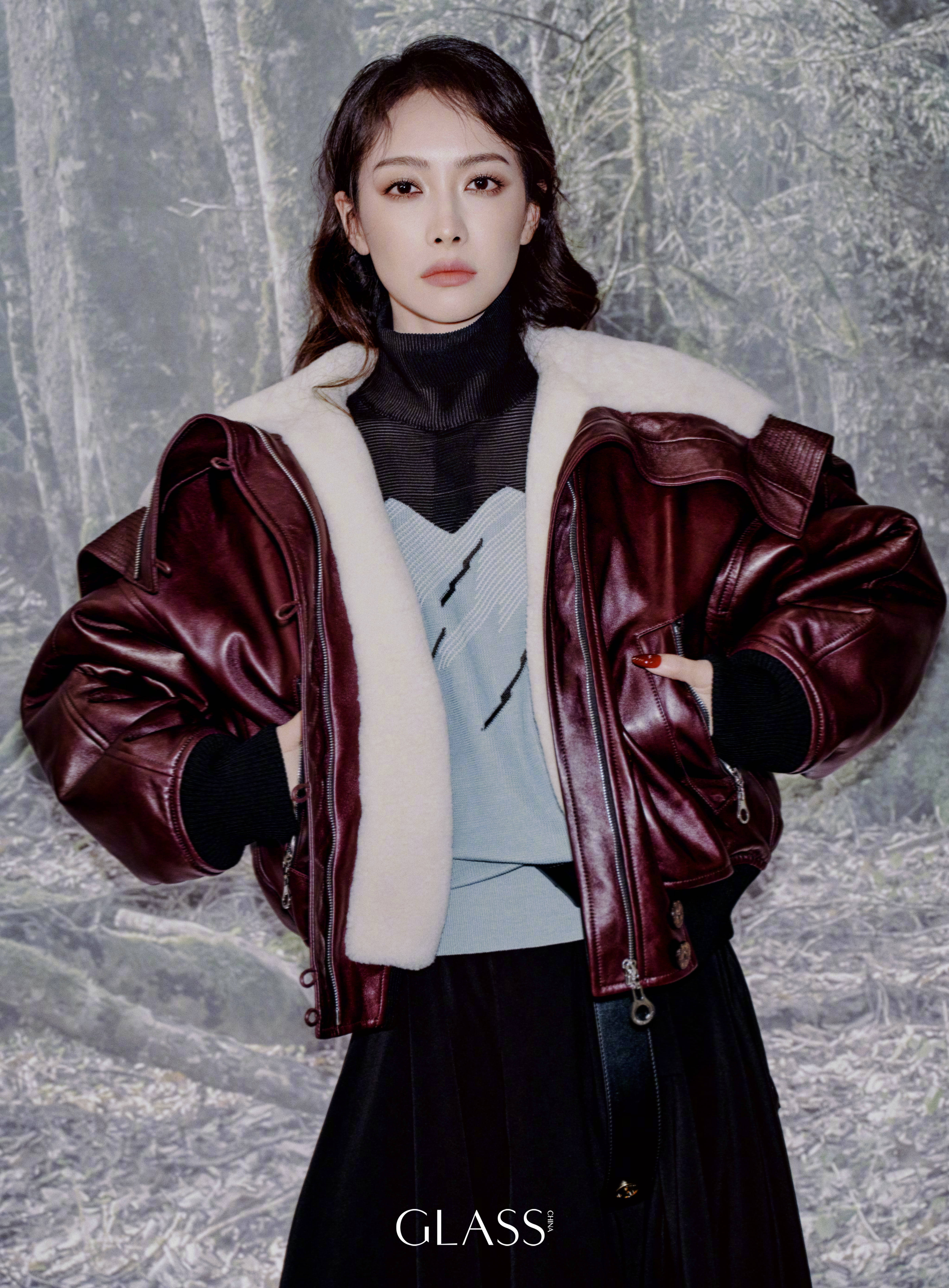 宋茜穿黑色风衣配红色长裙,卷发微乱,满是复古文艺感。