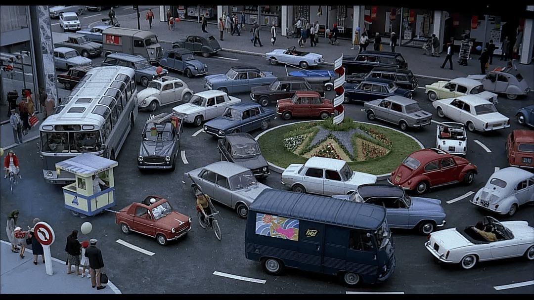 开头短片的车流,明显是在致敬法国导演雅克·塔蒂的《玩乐时间》。这部电影1967年法国上映,讲述于勒先生初入巴黎就被超级现代化的世界博览会大楼所震惊,并迷失于这座高科技大楼中。这部电影几乎没有对白,但用巧妙的音效加上演员出色的表演给观众留下很深印象。