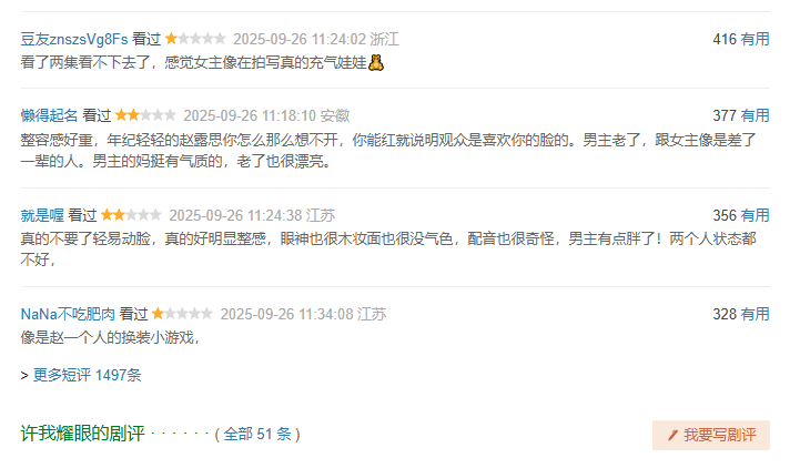 9月26日,电视剧《许我耀眼》在腾讯视频4集上线,正式首播。这部电视剧由赵露思、陈伟霆主演,讲的则是霸总爱上灰姑娘的故事。剧作走的是商业路线,而并非写实路线。该剧上线之后,在豆瓣出现了大量的差评。这些差评,主要集中在赵露思的面容和演技上,也有批评男女主角年龄不搭配的。当然,赵露思的粉丝们,也在积极应援,给这部电视剧打出好评。