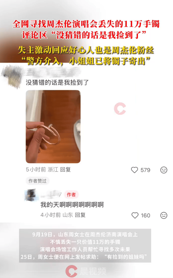 9月19日,山东网友周女士在周杰伦济南演唱会上不慎丢失一只价值11万的手镯,演唱会场馆工作人员帮忙寻找多次未果。 25日,周女士便在网上发帖求助:“有捡到的姐妹吗”,没想第二天奇迹就出现在评论区:“没猜错的话是我捡到了”。