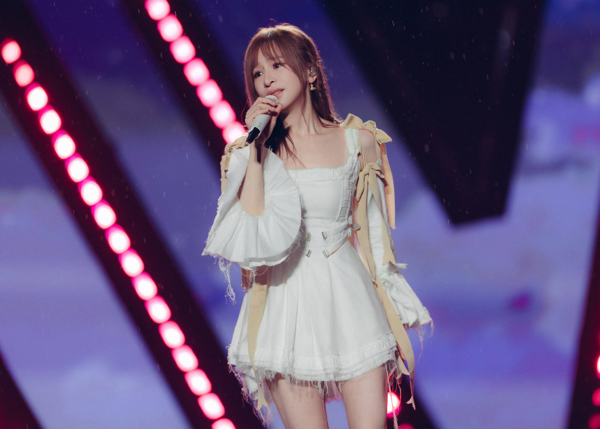 搜狐娱乐讯 26日,王心凌工作室晒出王心凌淋雨唱歌的露天舞台照,并配文称:“和阜阳的Honey一起淋雨,一起唱歌。”