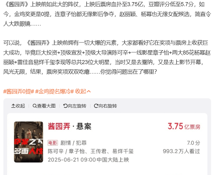 这其中《酱园弄》从演员到其他奖项0提名,让人意外,别说是陈可辛肢解电影造成的,被寄予厚望也得到肯定的章子怡,居然没有提名女主角。而女配角赵丽颖其实自己也主演了好几部电影,也是颗粒无收,在电影圈的认可度远不如她在电视圈的声望。而参演两部电影的杨幂,本以为可以横扫女配角提名,但也因为电影口碑不好或者戏份少,与提名无缘。