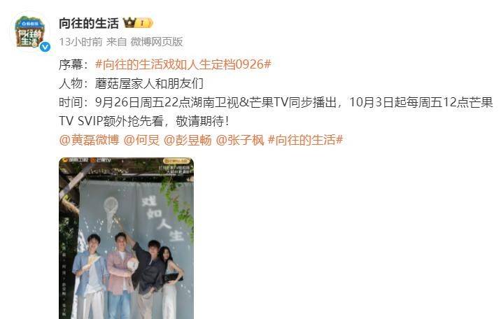 时隔两年啊,《向往的生活》又跟大家见面了,这次搞了个“戏如人生”的主题,听起来就挺有意思,还是那熟悉的味道,黄磊,何炅,彭昱畅,张子枫,这四个人都在,可是,总感觉少了点什么,对了,张艺兴呢,以前他不是都在吗,这次咋变成飞行嘉宾了呢,就来个四天,哎,有点可惜,有些人喜欢他,就想多看看他,少了点什么感觉的,听说啊,是因为他要开演唱会,档期排不开,哎,也没办法,演唱会重要,节目也重要,只能说,希望他下次能多来几天吧,粉丝们肯定很想他,评论区都炸了,可多了抱怨的。