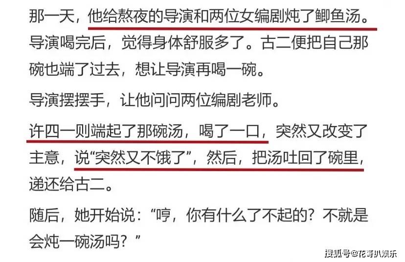 更过分的是,古二还得在剧组里给王家卫、秦雯和许四一做饭。秦雯和许四一对他那叫一个不待见,许四一甚至把汤吐回碗里,还阴阳怪气地说古二有啥了不起的,不就是会炖汤吗?不知道还以为误入狗血宫斗剧了。