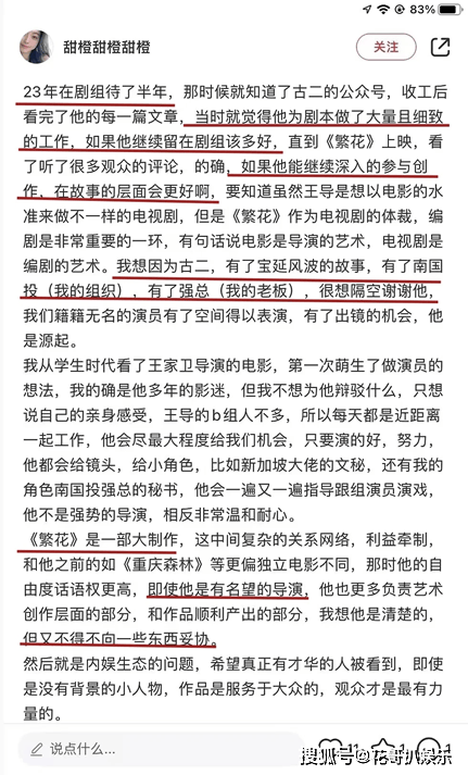这两天影视圈大瓜当属《繁花》编剧开撕,这部剧可以说是这些年少有叫好又叫座的作品。家人们,这几天娱乐圈那叫一个热闹非凡,王家卫首次执导的电视剧,质量绝对有保障,直接拿下第29届白玉兰最佳电视剧奖,男主胡歌也凭借此剧斩获最佳男主,就连之前演技备受争议的唐嫣风评都来了个180度大转弯。可谁能想到,这曾经叫好又叫座的剧,如今却因为“欺压小编剧”的争议,又双叒叕登上热搜了,这剧情反转比电视剧还精彩。