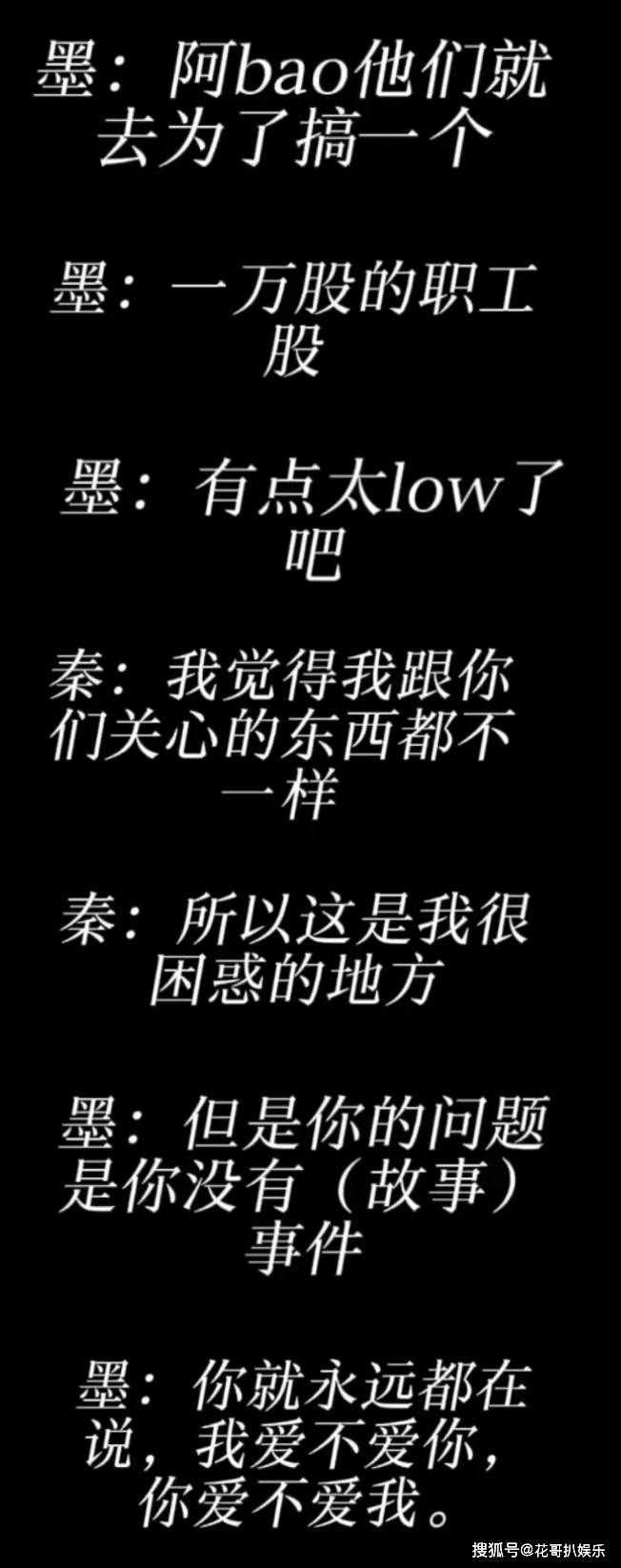 这个说法除了有和王家卫的聊天记录佐证,还有录音。也就是古二、王家卫、秦雯、许四一的聊天记录,在这个聊天局里,古二还在给他们仨做饭。从这场聊天里,我们能得到不少有效信息,王家卫确实看不上秦雯和许四一的创作。他直接说秦雯的创作点太low了,只会写情情爱爱,不会写故事。