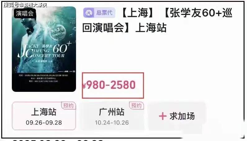 以9月26张学友上海站演唱会为例,最低价980元,最高价2580元。