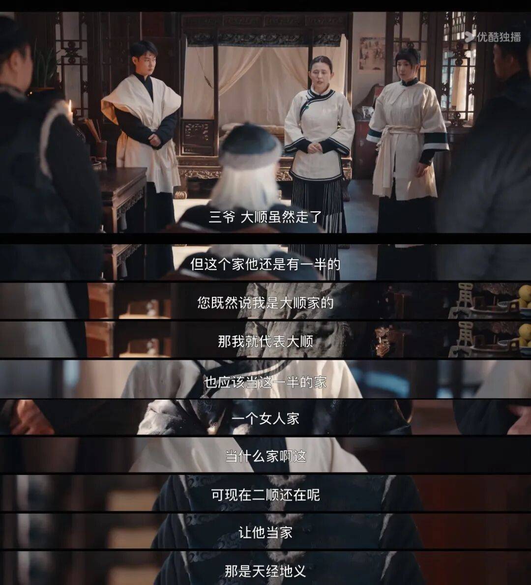 剧情回顾:陈家大哥陈大顺去世后,其妻褚韶华与二哥陈二顺之间因家庭共有财产的分割问题产生激烈矛盾。族长表示,家产应交由陈二顺管理。褚韶华不同意,表示父亲当时答应了分店给他们一半的股权。族长则称就算有,也是陈大顺还在的时候,现在陈二顺还在,不可能让女人当家。