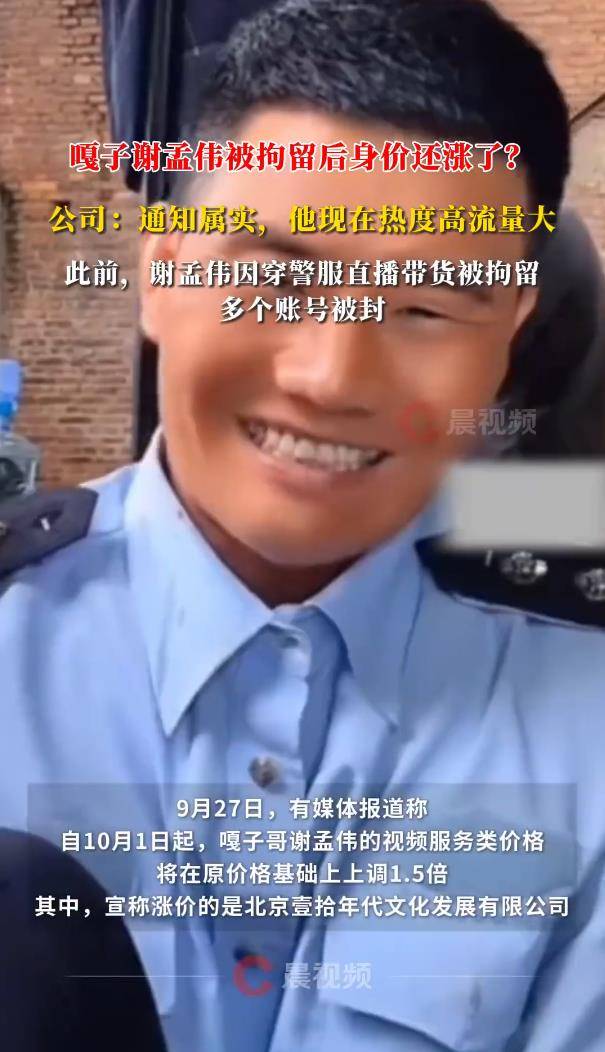 演员谢孟伟(嘎子哥)因穿警服直播带货被行政拘留7天后,其代理公司“北京壹拾年代文化发展有限公司”竟宣布视频服务类价格上调150%。这波“黑红也是红”的涨价操作,瞬间在网络上炸开了锅。