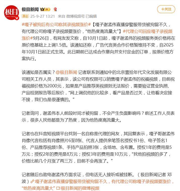 记者联系该公司后,工作人员直接承认:“通知确实是我们发的,涨价消息属实。”对于拘留事件引发的负面舆论,公司回应称:“很多人找他就是为了热度,他现在热度高流量大。”同时强调合作前会审核产品资质,最终由谢孟伟本人决定是否接单。