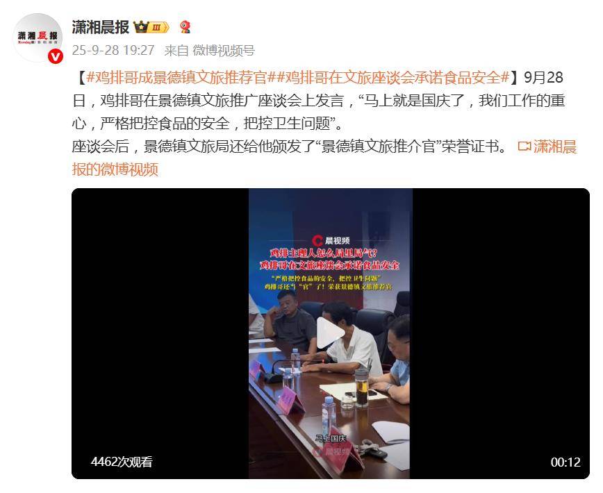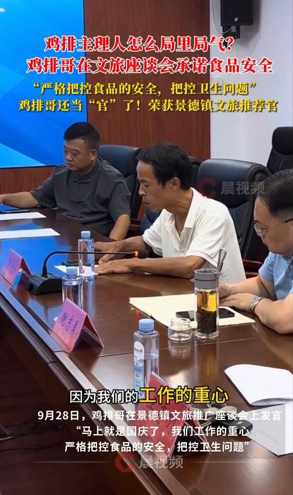 9月28日报道,网红摊主“鸡排哥”李俊永现身景德镇文旅推广座谈会的消息,让这位卖炸鸡排的老板彻底火出了圈。会上,他不仅被正式授予“景德镇文旅推介官”的称号,更因一番逻辑清晰、气场十足的发言,被网友调侃为“6元鸡排讲出了6亿项目的气魄”,堪称“局里局气”的典范。