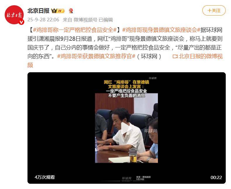 在9月28日的座谈会上,鸡排哥被正式授予“景德镇文旅推介官”称号,当场接过文旅局颁发的荣誉证书。面对国庆旅游高峰,他明确表态:首要任务是严格把控食品安全与卫生,每日公示检测报告,确保经营合规,并承诺“尽量产出正向内容”。