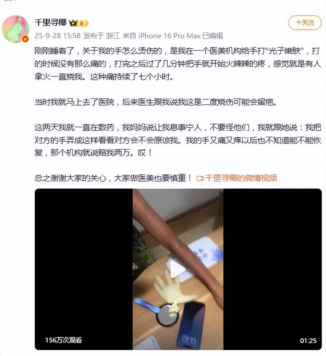 一则来自网红“千里寻椰”的血泪控诉,将医美背后的安全风险再次推至风口浪尖。网红“千里寻椰”在9月28日自曝,她在浙江某医美机构接受手部光子嫩肤治疗,术中仅感轻微痛楚,不料术后短短几分钟,双手便突遭持续长达七小时的“火烧样”剧痛折磨。经医院诊断,其左手为深二度烧伤,伤势严重,右手亦有轻微烫伤,医生坦言可能永久留疤。这场追求美丽的尝试,最终以一场痛苦的医疗事故告终。