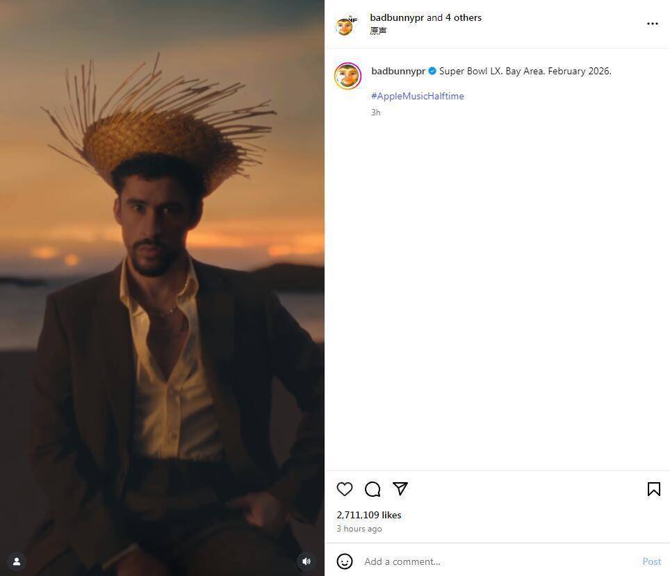 据外媒报道,美国知名歌手坏兔子(Bad Bunny)将担任2026年超级碗中场秀主表演嘉宾,他在个人社交媒体发文确认。