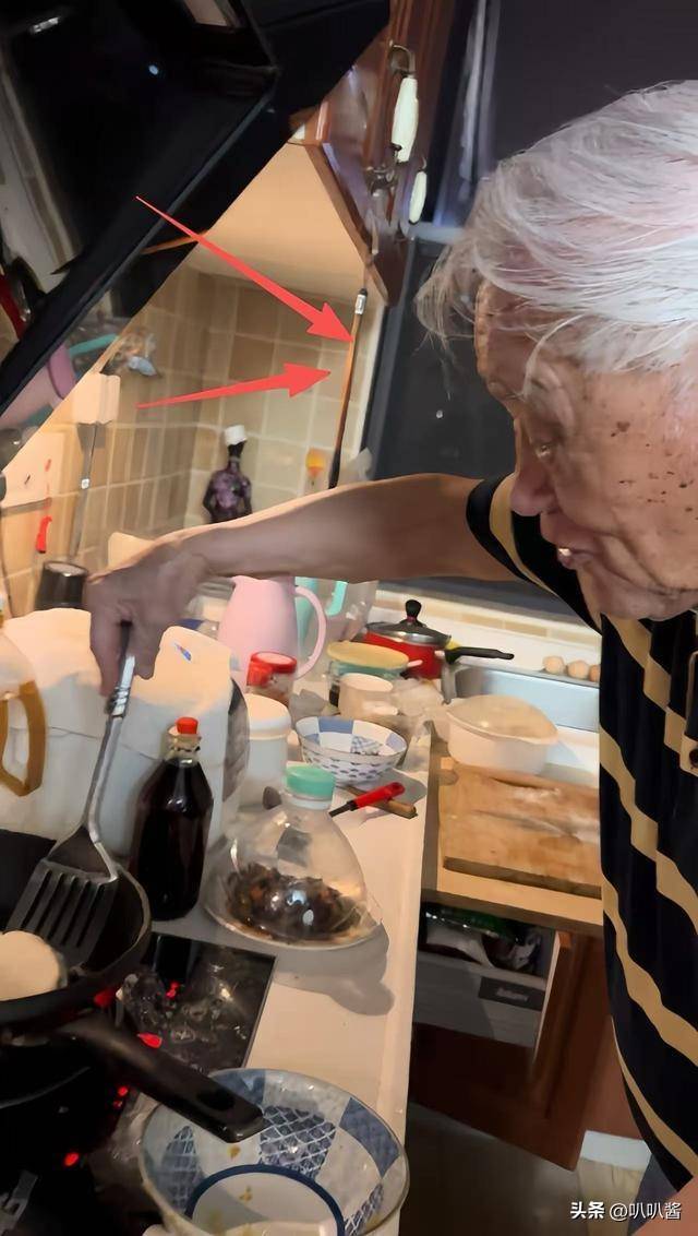 视频中,这位90岁的牛犇站在灶台前,一手拿着锅铲,翻动着锅里的食物。