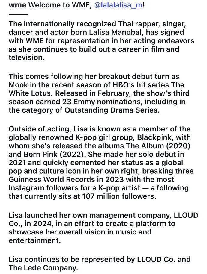 根据合约,WME将独家负责Lisa在全球范围内的电影、电视剧选角及国际项目资源对接,而音乐事务仍牢牢握在她个人公司LLOUD与合作方The Lede Company手中。这一手“影视靠大厂、音乐自己扛”的布局,被业内解读为Lisa转型战略的关键一步:既借力顶级专业资源冲击影视圈,又保持音乐领域的自主权。