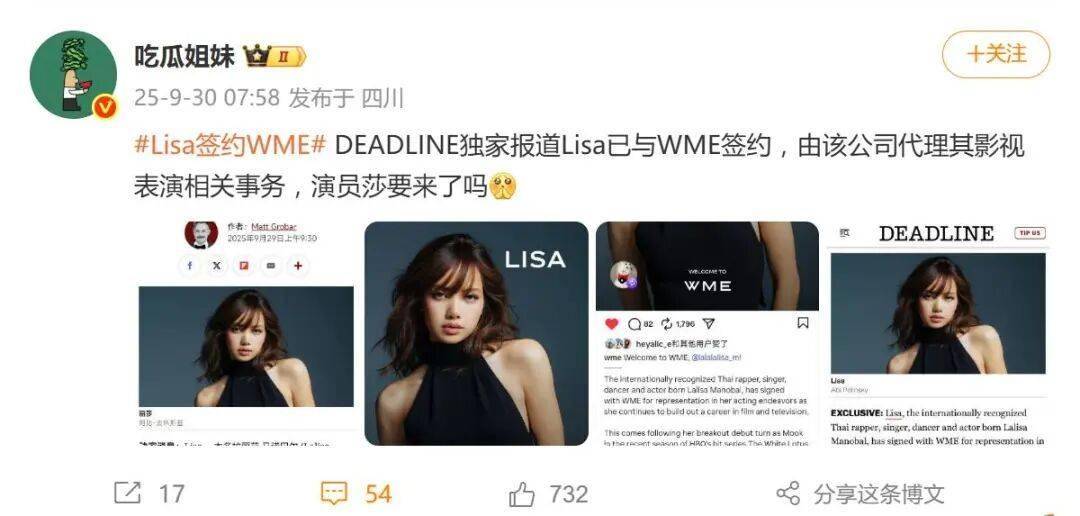 一则“Lisa签约WME”的消息,瞬间炸穿娱乐圈。9月30日,网友扒出外媒DEADLINE独家报道:BLACKPINK成员Lisa已正式签约好莱坞三大经纪公司之一WME,由该公司全权代理其全球影视表演事务——这意味着,“演员Lisa”的招牌,即将强势插进好莱坞核心地带。