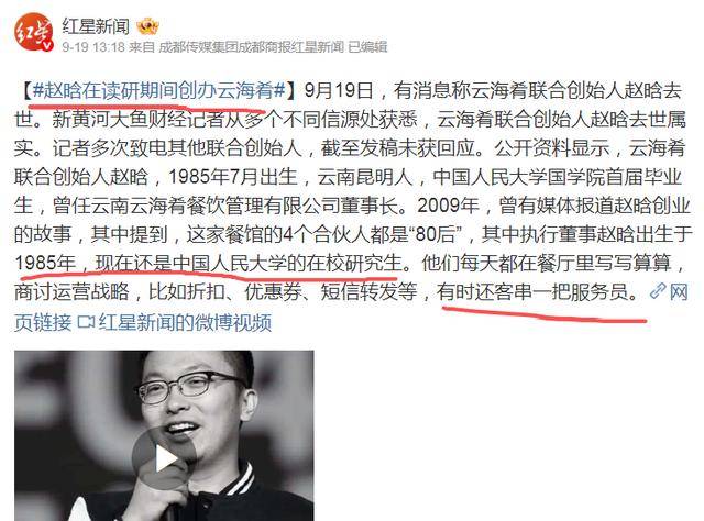 9月19日,知名云南菜品牌“云海肴”官方发布讣告:品牌ceo赵晗,于18日突发心梗离世,年仅40岁。