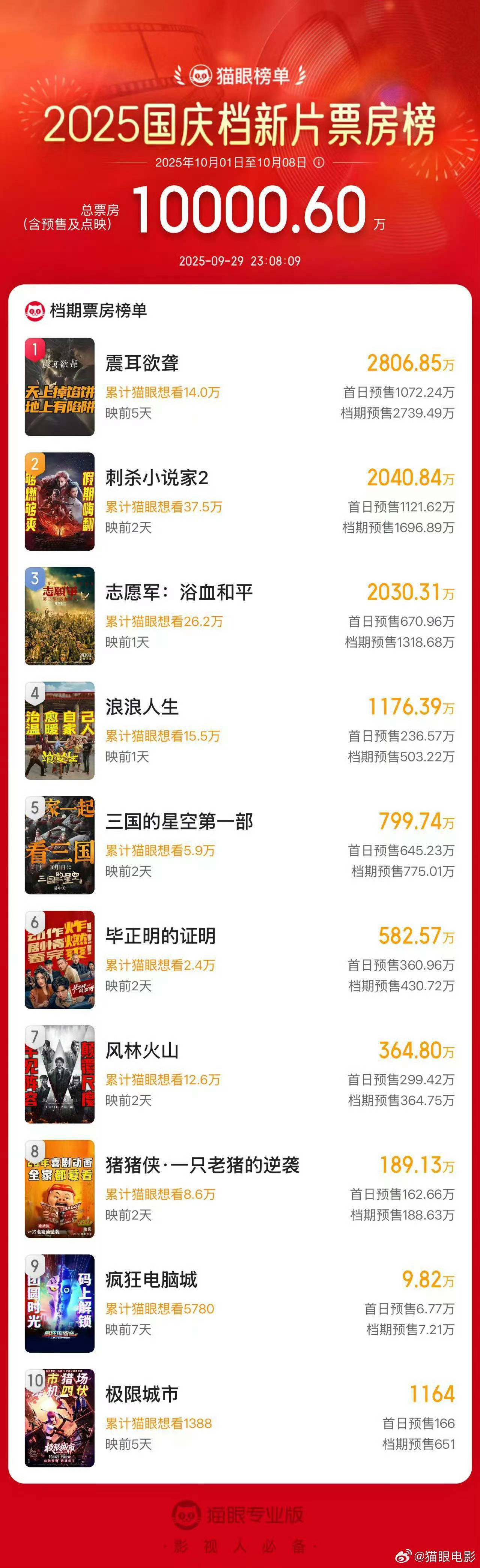 搜狐娱乐讯 据猫眼专业版数据,截至9月19日23:08,2025国庆档新片预售总票房破亿,《震耳欲聋》《刺杀小说家2》《志愿军:浴血和平》分列前三位。