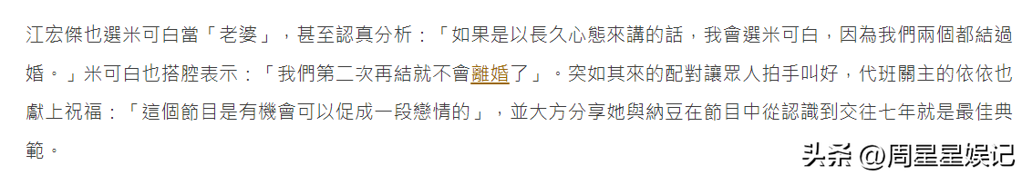1、在某一期《全员请上车》真人秀中,选择艺人米可白当剧中的“老婆”,并发表心声:“如果是以长久心态来讲的话,我会选米可白,因为我们两个都结过婚。”