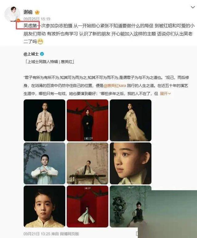 9月25日,吴京的妻子谢楠在社交平台上晒出了二儿子吴虑的杂志拍摄。