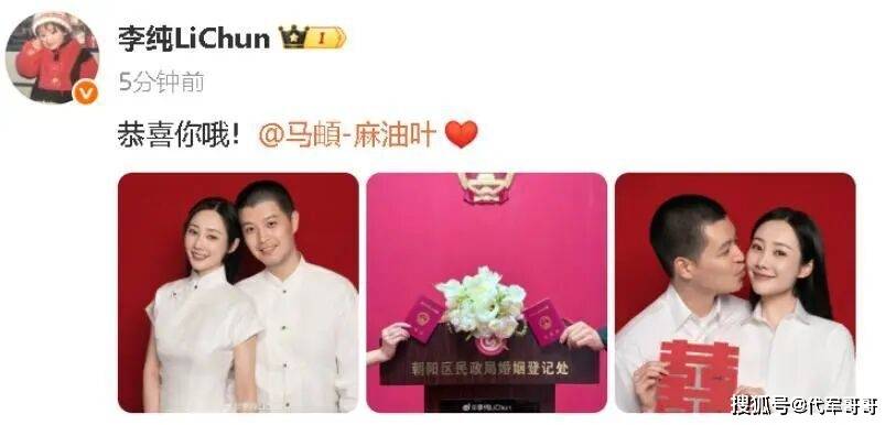 2025 年 10 月 2 日正午 12 时,李纯与马頔的社交账号同步刷新 —— 红底证件照上,李纯身着改良白旗袍,精致盘扣与刺绣衬得身姿曼妙,温婉笑容宛若古画佳人;马頔则以简洁白衬衫搭配寸头,憨厚笑意藏不住眼底星光。