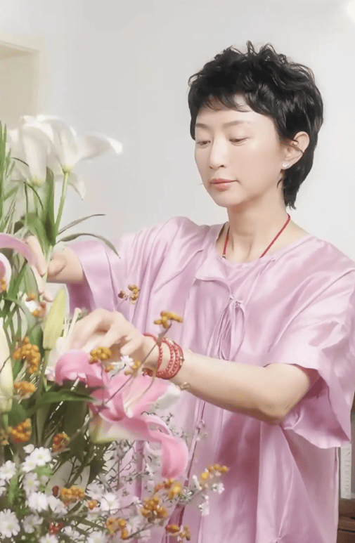 比许亚军小12岁的张澍则是穿着一身粉色的新中式套装,在一边摆弄鲜花