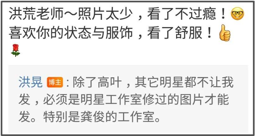 网友留言让洪晃多发几张照片,她一不小心说了大实话,表示除了高叶,其他明星都不让发,必须是明星工作室修过的图片才能发,还点名了龚俊工作室。