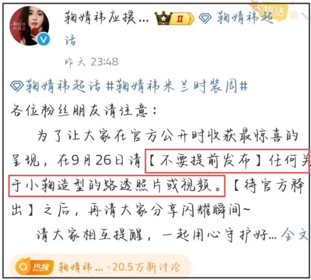 不仅如此,网友还发现,鞠婧祎官方后援会还专门发动态强调,拍到鞠婧祎的现场照和现场视频不要提前发布。