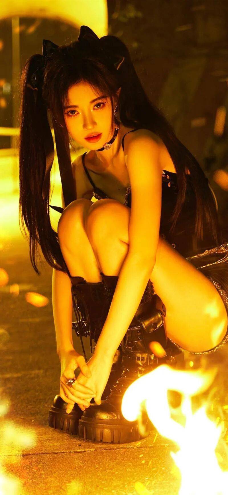 鞠婧祎穿着黑色衣裤,她长发梳成马尾巴,蹲在地上的样子很妩媚,露出白皙的香肩和傲人的大美腿,再加上黄色的灯光照耀,绝对性感火辣!
