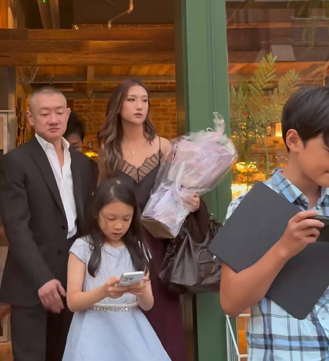 看完女儿演出后,汪雨和老婆又带着孩子们去吃饭,汪雨护在小女儿身后,画面中还有一个小男孩,边走路边抱着平板,瘦瘦高高的,长得真是和汪雨一模一样。