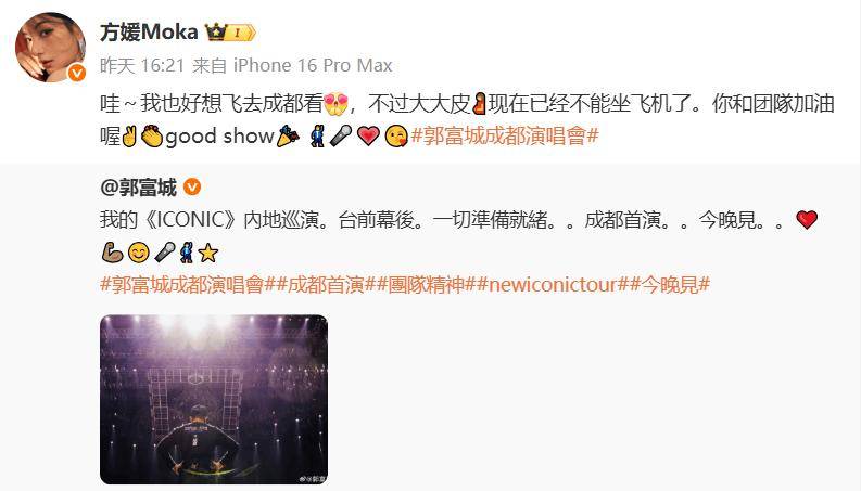 方媛则回应表示:“哇~我也好想飞去成都看,不过现在肚子这么大,已经不能坐飞机了。你和团队加油喔,good show。