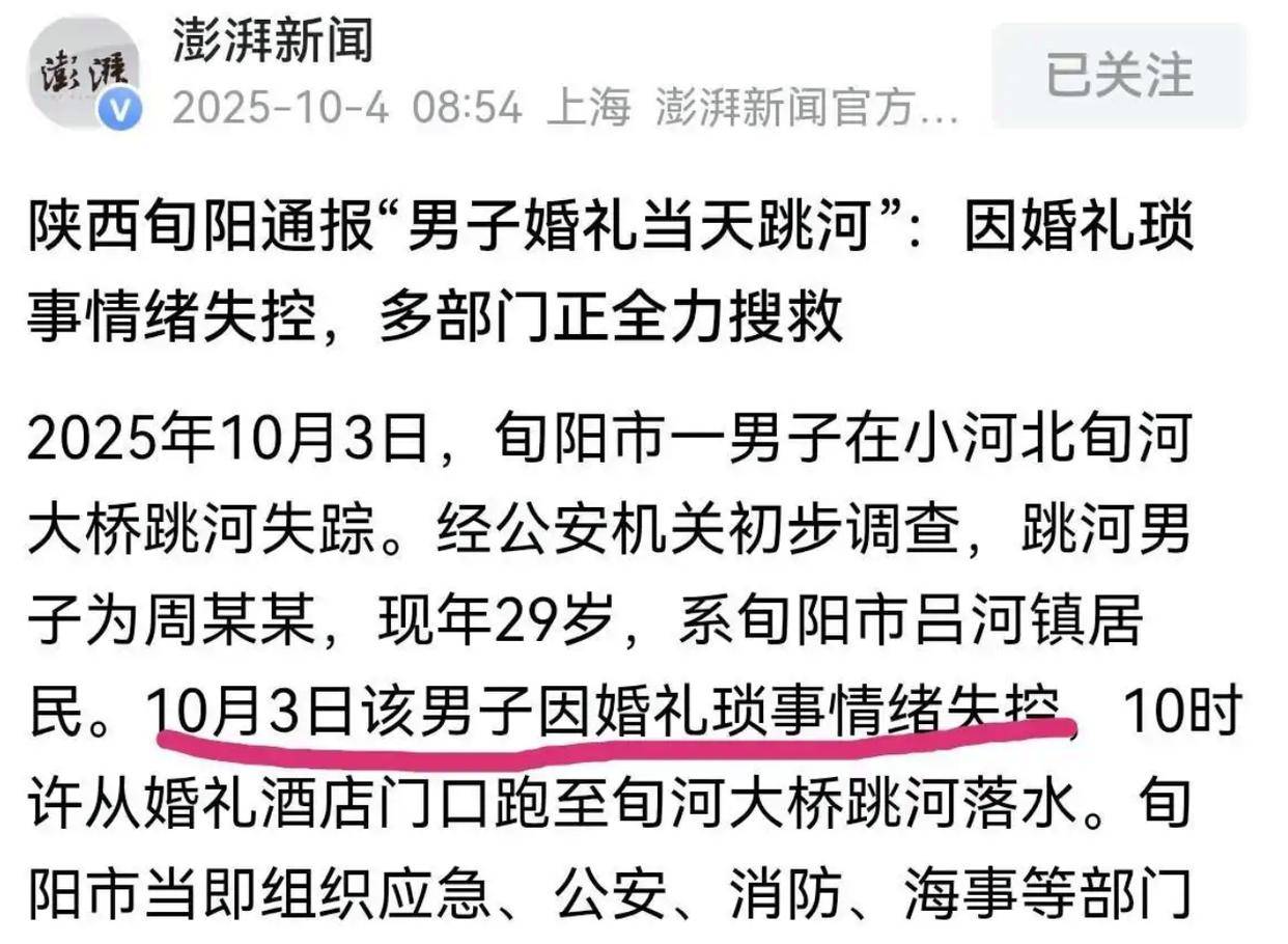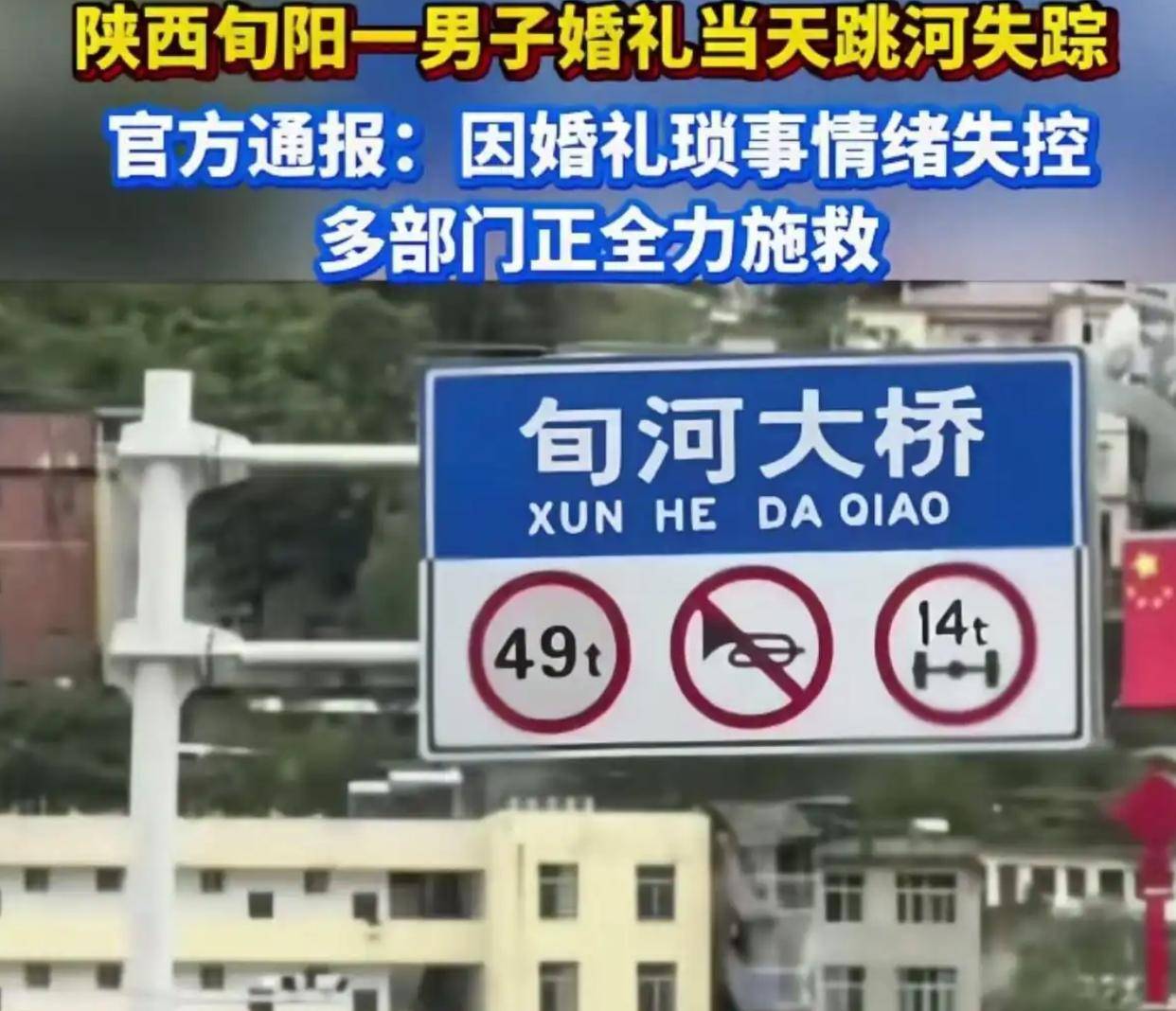 10月3日,陕西旬阳,一个29岁的年轻新郎,在婚礼当天,从冰冷的旬河大桥上跳了下去,至今下落不明。
