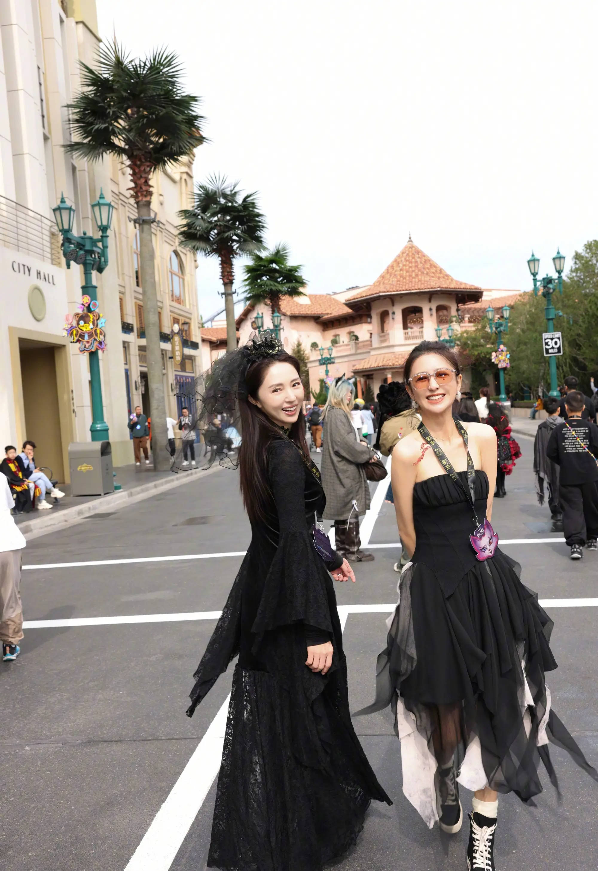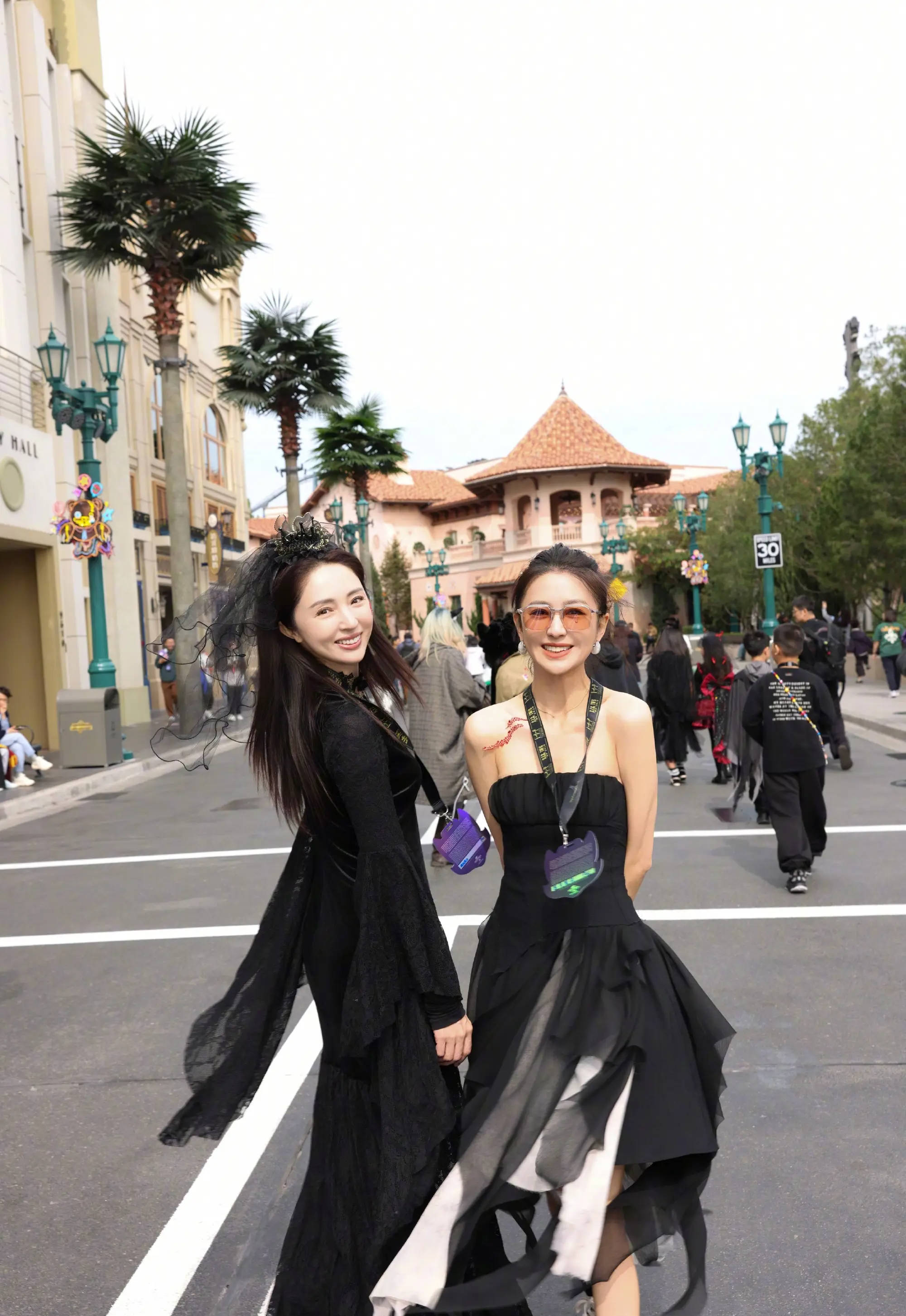 董璇与好姐妹佟丽娅一起在环球影城里拍美照,状态超好。