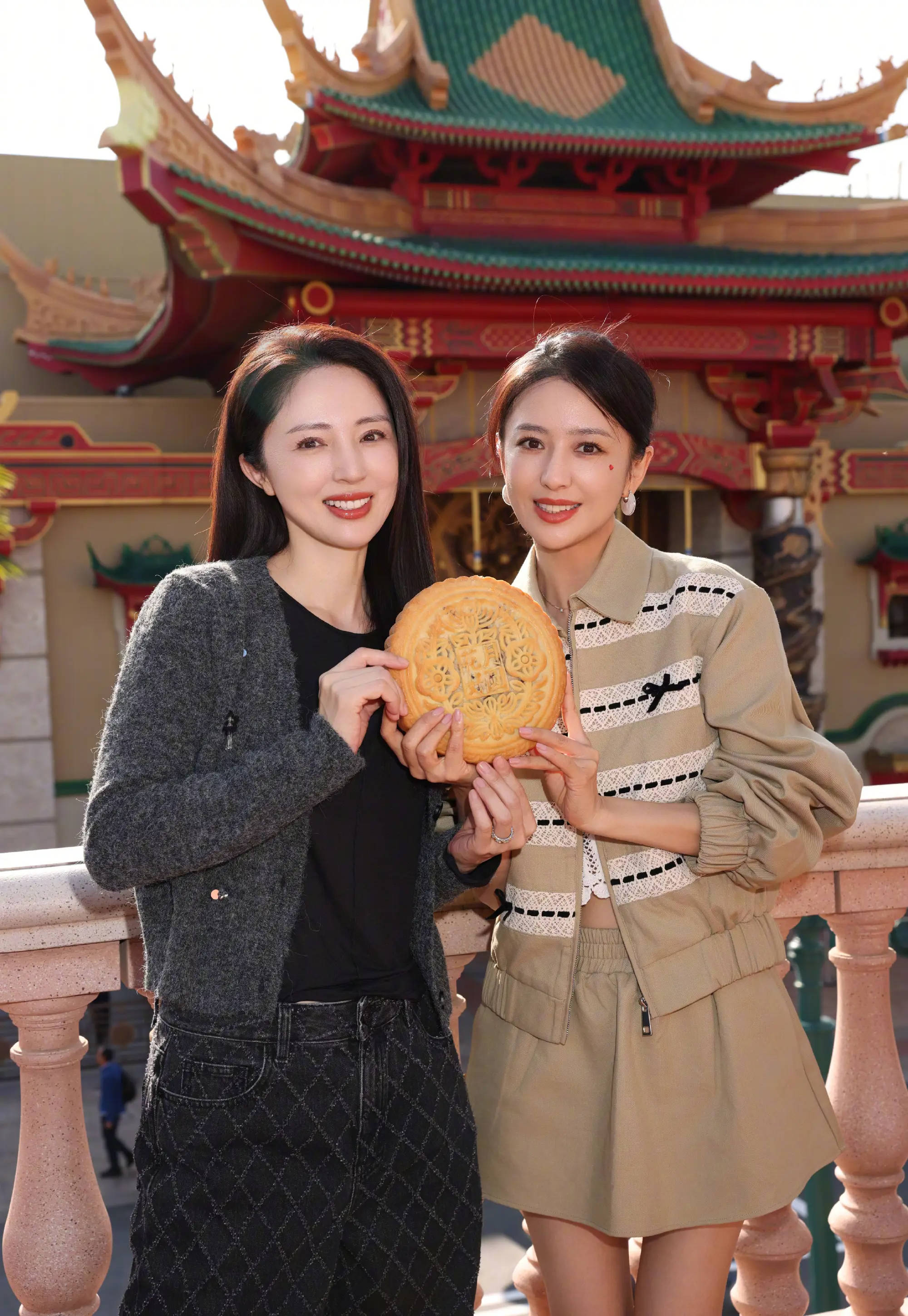 董璇与佟丽娅拿着大月饼拍照,笑容甜美迷人。
