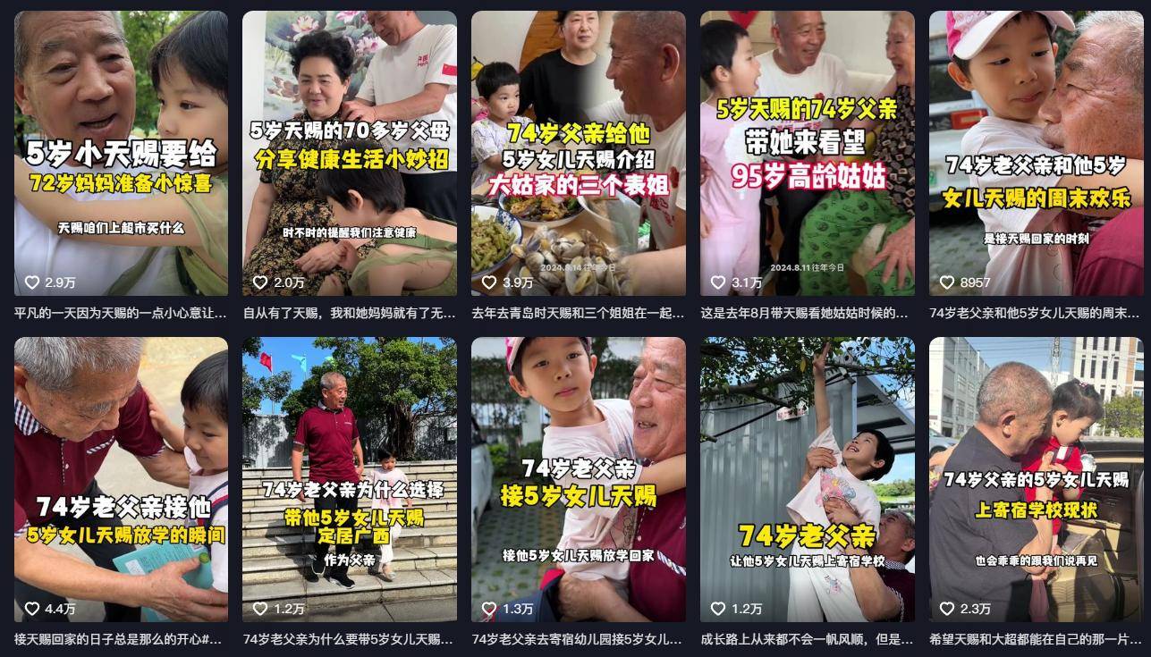主页封面更是直截了当:《5岁天赐和70多岁父母在广西过中秋》《5岁小天赐要给7岁妈妈准备小惊喜》等等。