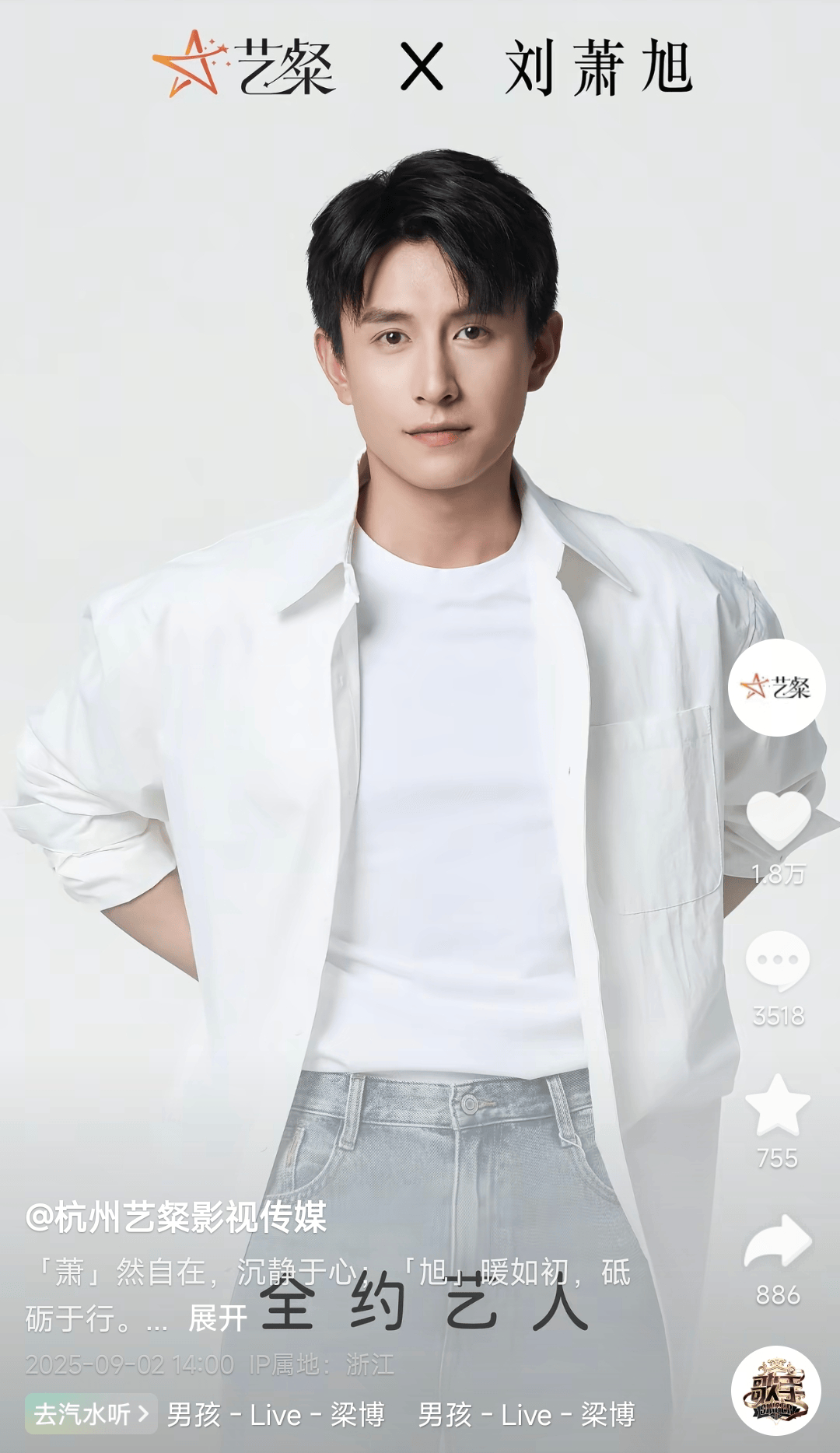 这家同时运营了马厩制片厂(《盛夏芬德拉》制片公司)、赤兔制片厂,并投资了艺粲传媒(刘萧旭签约的经纪公司)的短剧版权方,对刘萧旭的上升趋势做出了准确预判,抢先在9月2日将他签约为“全约艺人”。