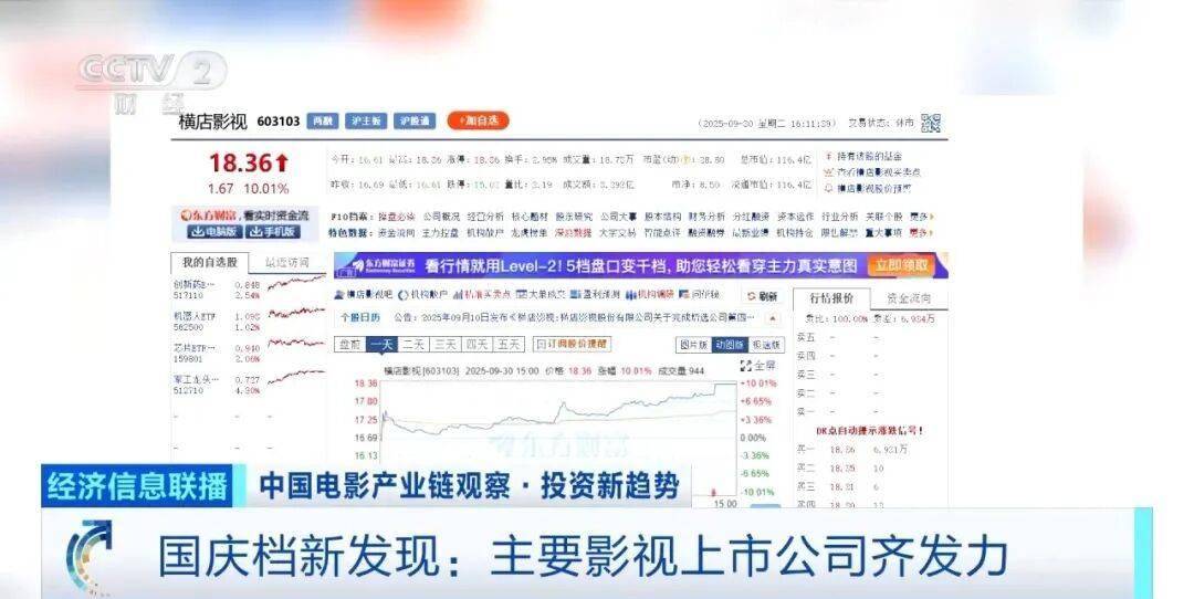 记者注意到,今年国庆档电影的背后几乎集齐了国内主要影视上市公司。假期A股休市,但在节前,影视板块已出现明显升温迹象。在节前最后一个交易日,横店影视收盘涨停,华策影视上涨5.57%,光线传媒、北京文化等小幅跟涨。